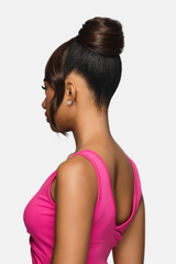 The BPB-Rosa is a synthetic hairpiece featuring fringe ends with 10-inch loose curls on both sides and a wispy whirl bun.