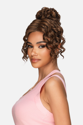 - 26″ Layered Loose Pieced Spiral Curl Center Lace Bang Pony