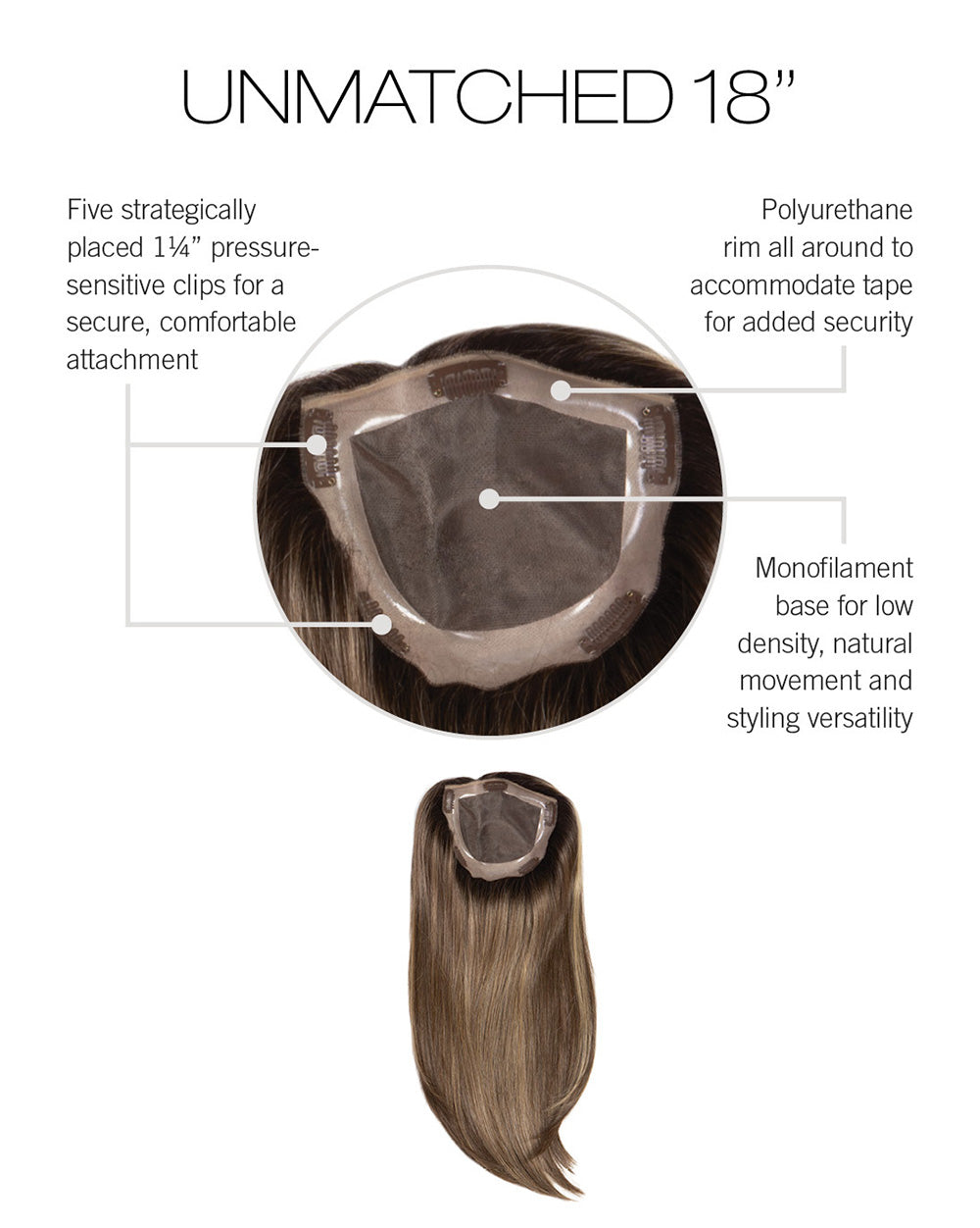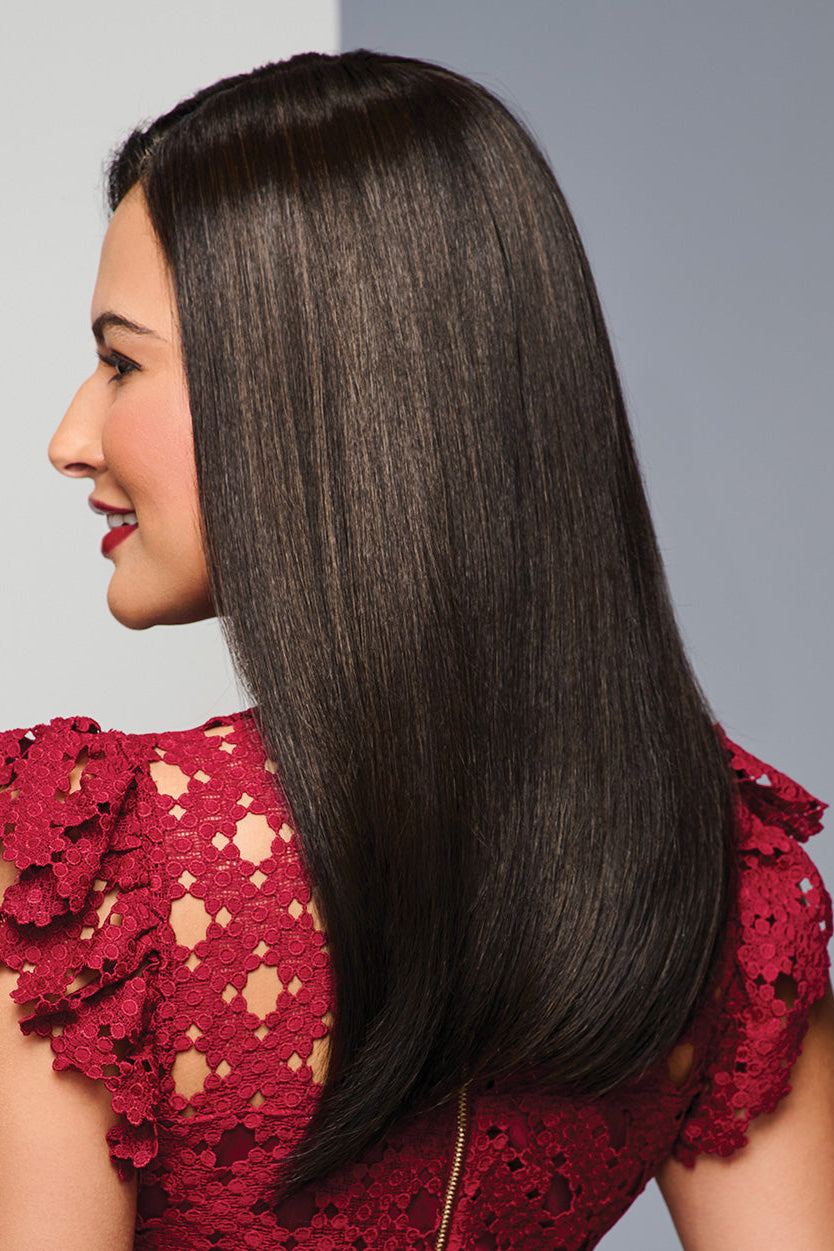 Unmatched 18” by Raquel Welch extends the style of the Unmatched 12” with added length. From the Transformations Collection, this long topper features a hand-tied monofilament base that offers a light, comfortable fit. Crafted with Tru2Life heat-friendly synthetic fibers, it allows you to style freely and easily for a natural look.