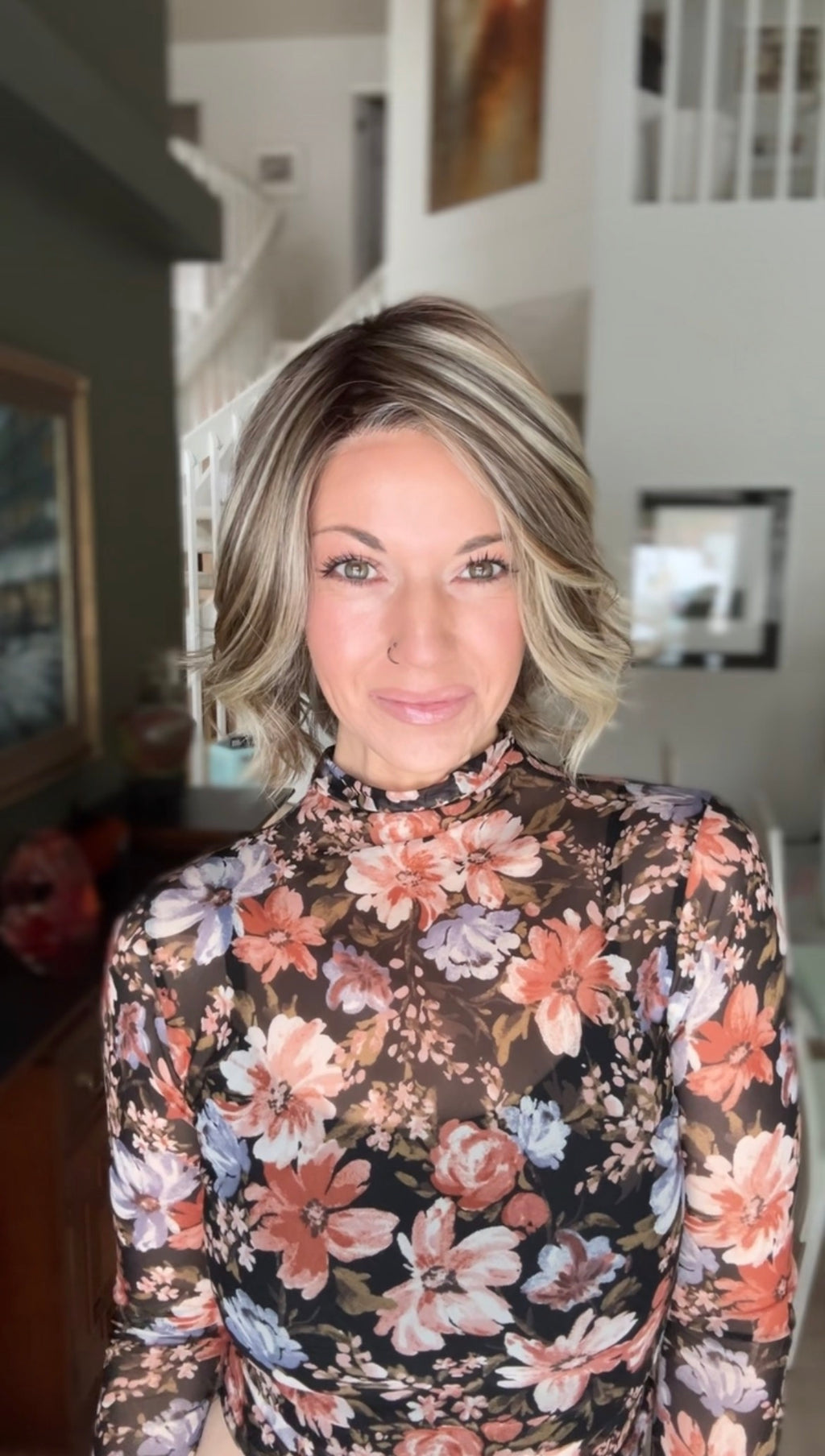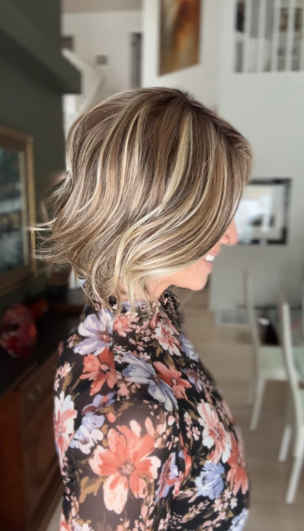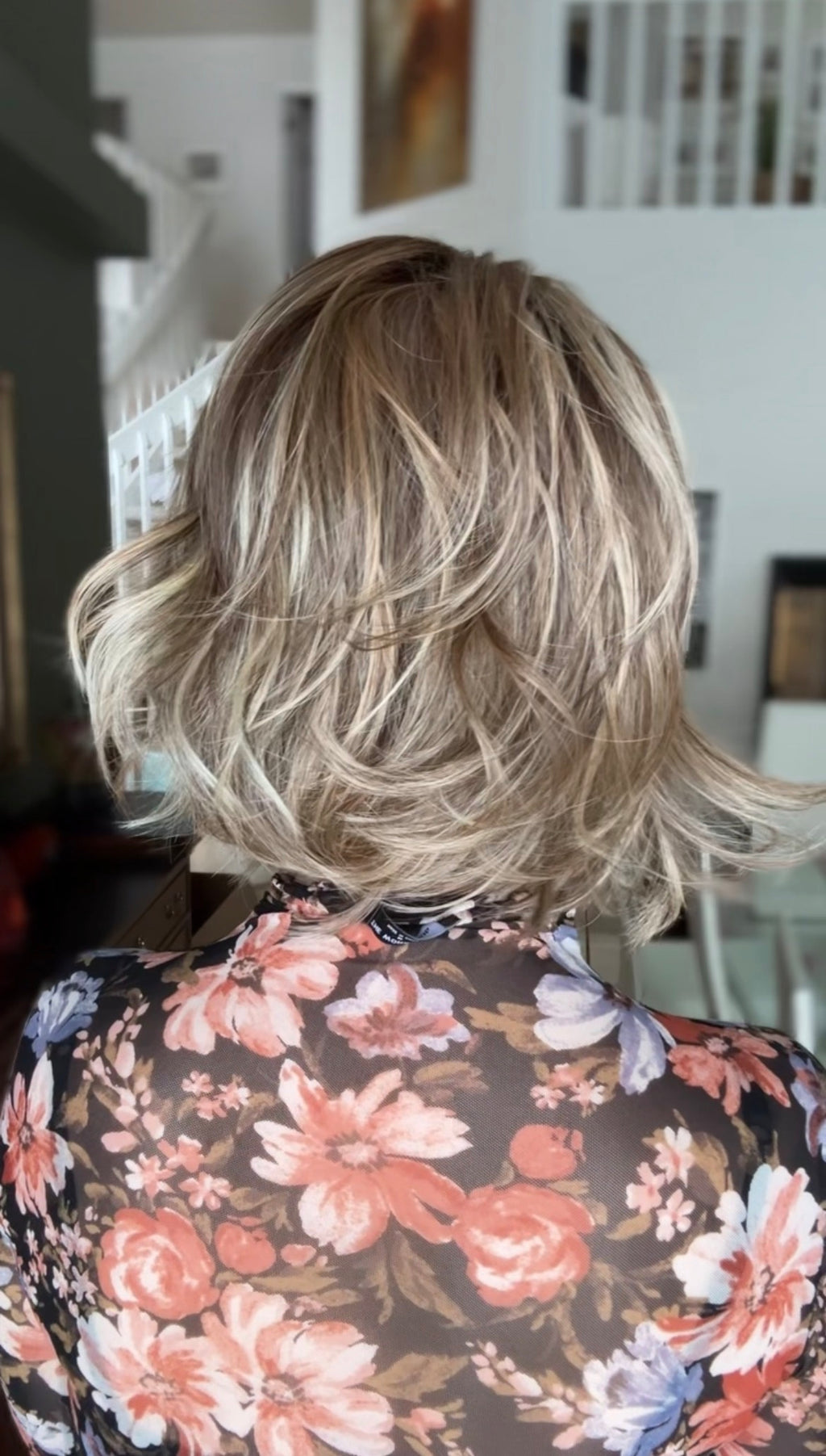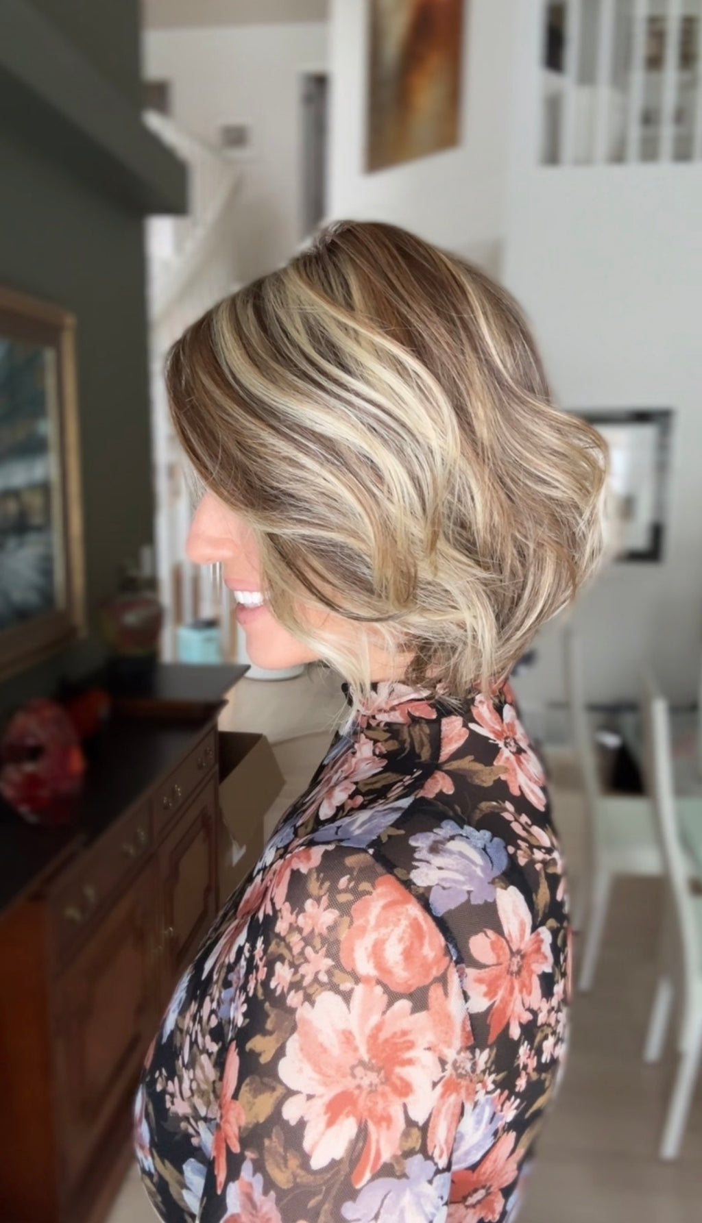 This chic bob features a softly layered shape with loose, natural waves that create effortless movement and light volume. The length sits just below the chin, offering a flattering, modern silhouette that feels polished yet relaxed. Subtle layering throughout keeps the style airy while allowing the waves to fall naturally from every angle.